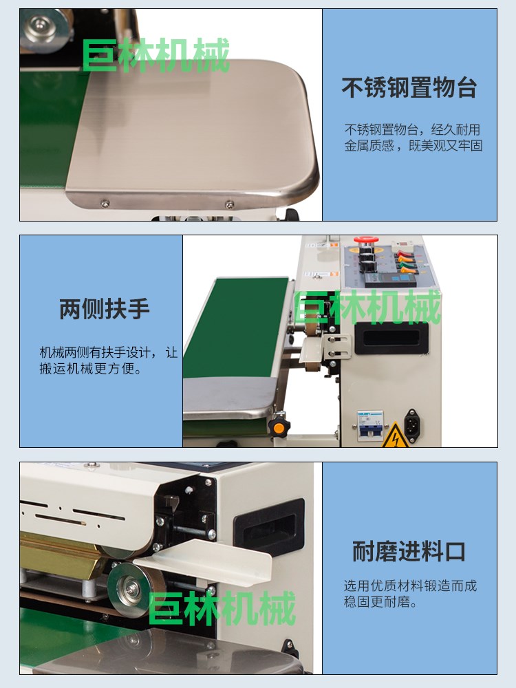 本機是新一代集印碼,封口,連續(xù)輸送為一體的自動薄膜封口機,具有印字清晰、顔色可選、即印即干、換字方便等特點。